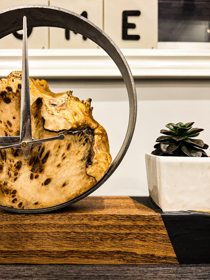 This modern live edge clock is perfect for those who love the contrast of organic and contemporary design. Whether placed on a mantel, desk, or shelf, it will instantly draw attention as a functional sculpture for your home.
