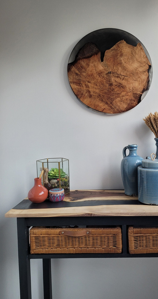 This wall clock, crafted from a live-edge mixed with epoxy, showcases the wood’s unique grain and organic form, blending rustic charm with functional elegance.