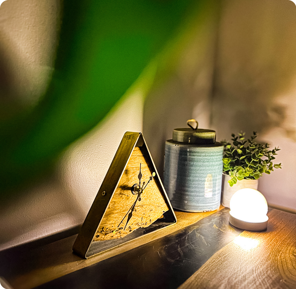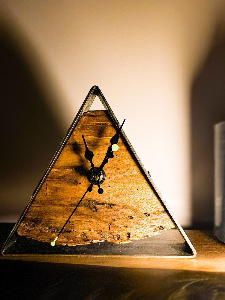 This live-edge table clock is elegantly framed by a triangular ring, blending organic wood textures with geometric design for a unique and modern timepiece.